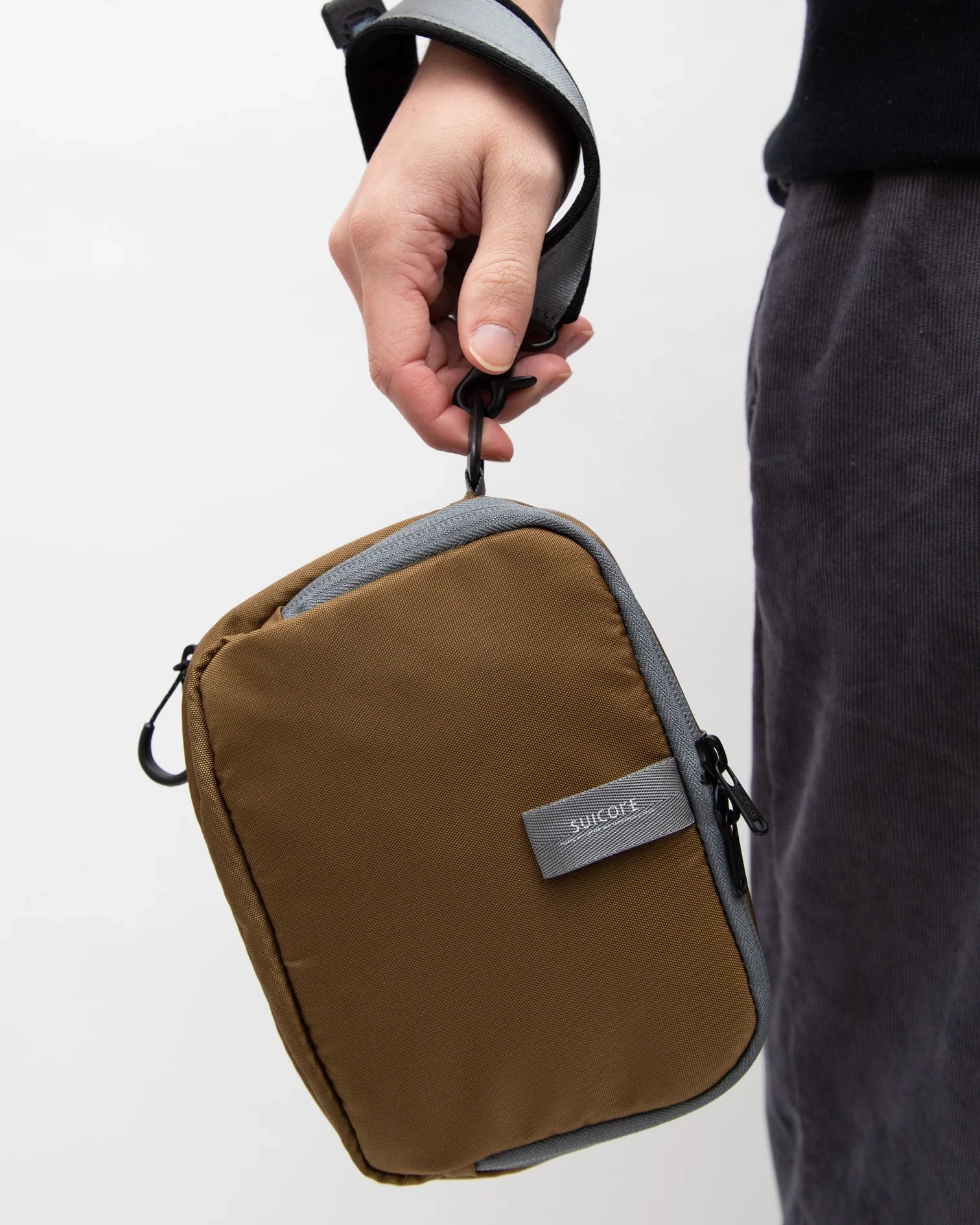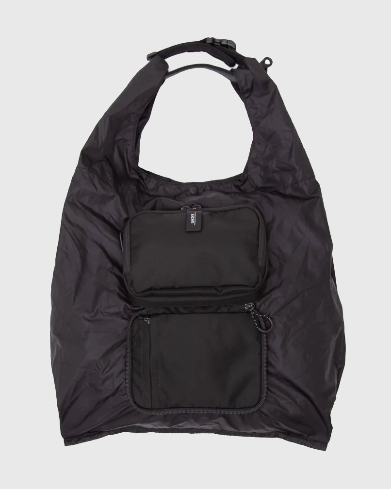 An original SUICOKE 2-way bag made primarily from 66 nylon taffeta, featuring an integrated pouch and tote-style eco bag, and comes with a hand strap.