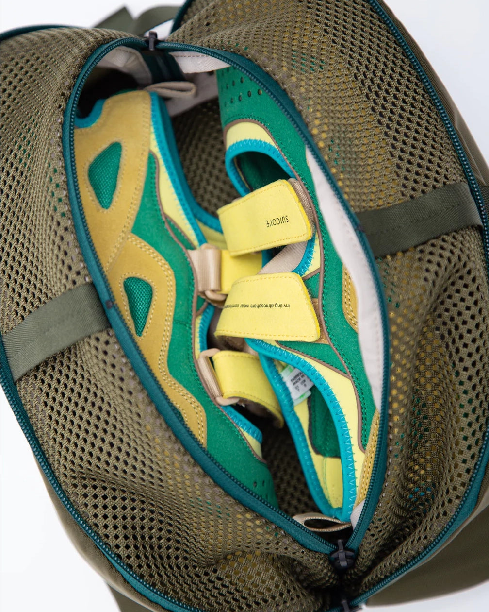 リサイクルコーデュラナイロンと、厚手ながら肌当たりの良いポリエステルメッシュを主素材とした、SUICOKEオリジナルのシューズケース兼スリングバッグ。